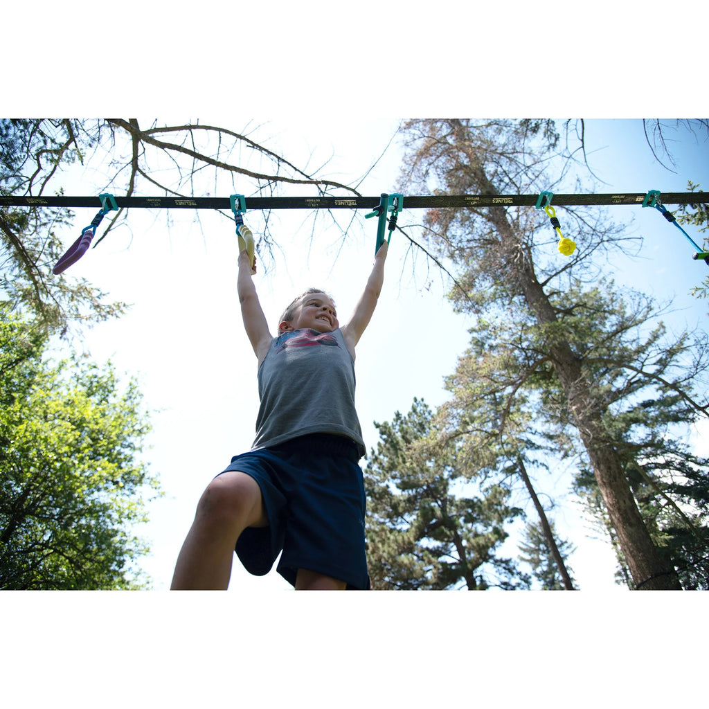 PLAY LIKE a NINJA! The new Trelines Ninja Adventure Line is a super popular item for shorter Ninja course 30'(10M) or less. Kit contains: 36 Line and Ratchet, 2 Monkey Bars, 2 new Tree Gym Rings, 2 Monkey Fists and 2 Multi Purpose Gym Rings, Ratchet Cover and Storage Bag, and 10 Treline Clips and Delta Carabiners. For Ages 5 and up. WARNING: CHOKING HAZARD - Small Parts. Not for children under 3yrs.