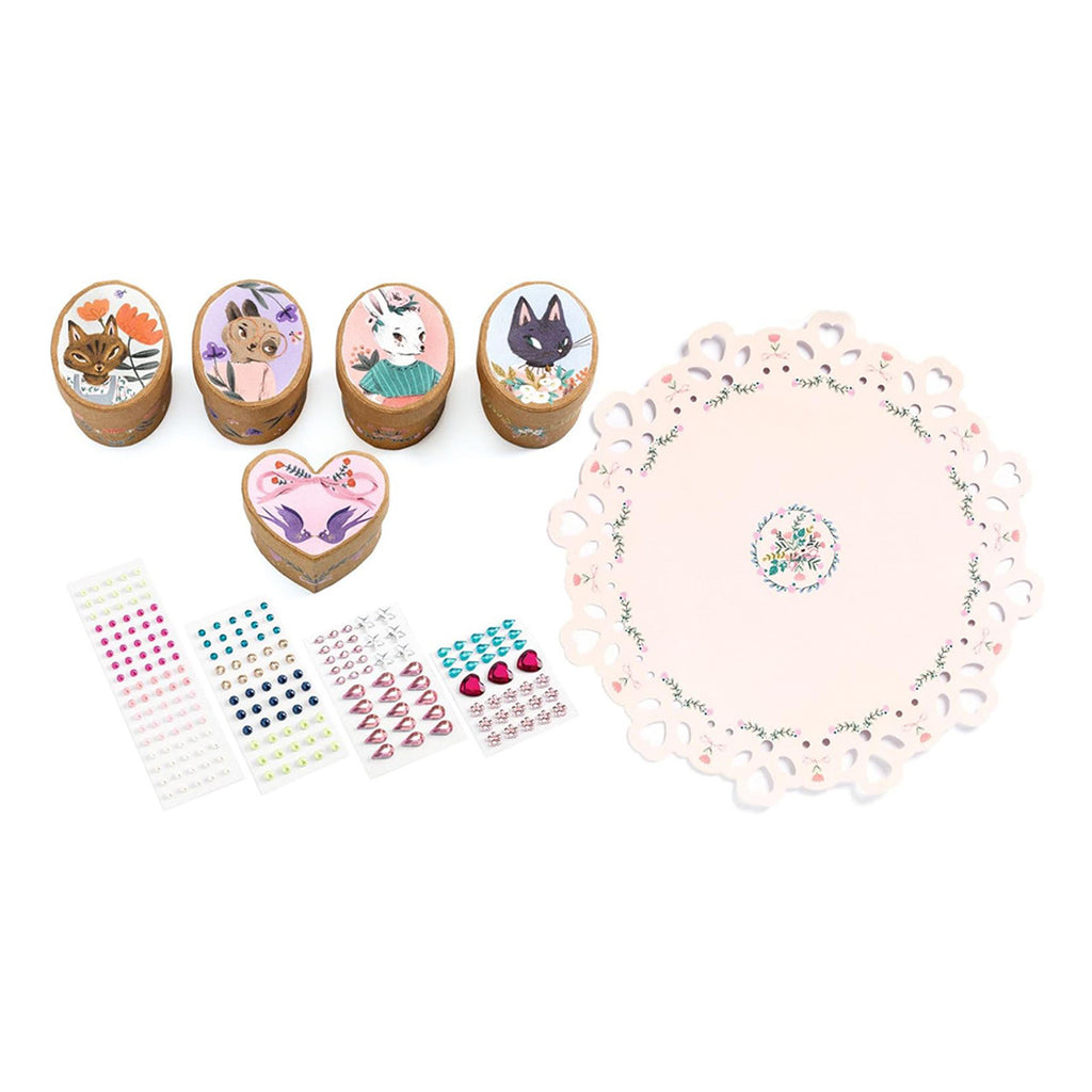 Decorate 5 mini boxes using over 200 self-adhesive gemstones with this Djeco DIY Adorable Mini Boxes Activity Kit. Perfect for storing small treasures and adding a sweet touch to any child's room. For Ages 5 and up. WARNING: CHOKING HAZARD - Small Parts. Not for children under 3yrs.