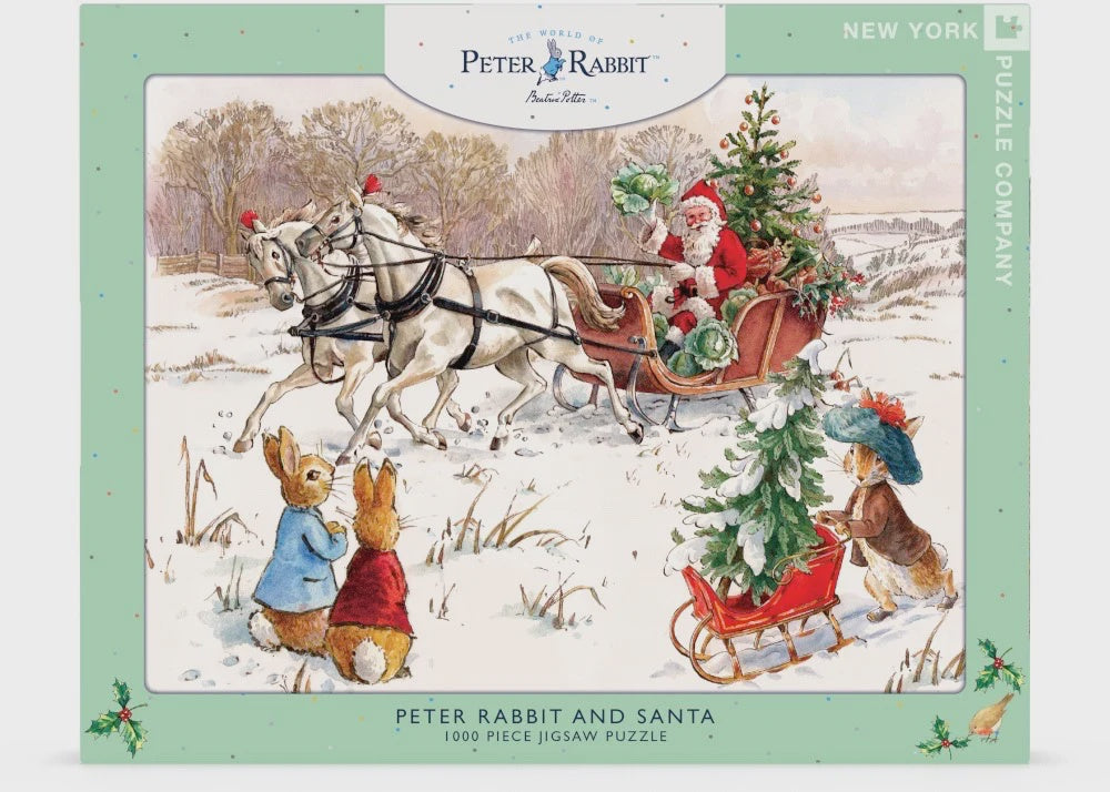 Celebrate the holiday season with a charming twist on a beloved classic in Peter Rabbit and Santa, a 1000 piece jigsaw puzzle inspired by Beatrix Potter's enchanting world. In this delightful winter scene, Santa Claus rides in a horse-drawn sleigh through a snow-covered field, bringing festive cheer—and a basket of cabbages—as gifts for Peter Rabbit and his woodland friends. As the friends prepare to take their Christmas tree home, the magical moment unfolds, blending holiday spirit with the timeless charm of Potter's beloved characters. Perfect for families, fans of Beatrix Potter, and puzzle enthusiasts, this heartwarming puzzle captures the joy of the season and the coziness of woodland friendship. Piece together this whimsical holiday adventure, and enjoy a festive journey with Peter Rabbit and Santa, one snowy detail at a time!