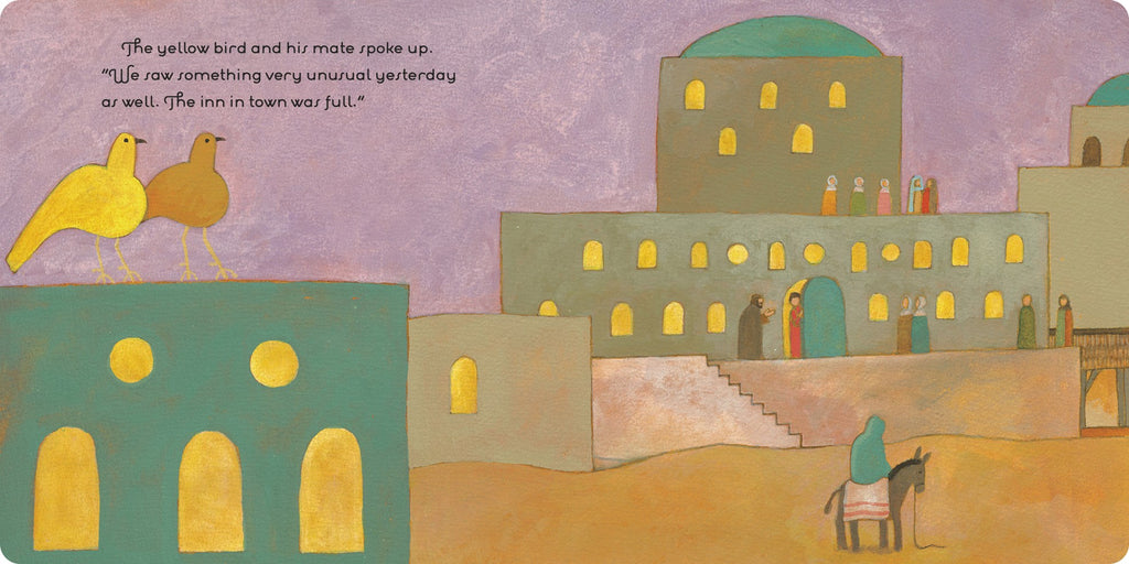 On the morning of the first Christmas, the birds of Bethlehem gather in the fields—not only to eat but to share exciting news. People from all over have descended on Bethlehem and an angel has appeared in the night sky. Something extraordinary is coming! The birds agree that they must find this wondrous thing, and off they fly to the stable where a child has been born.