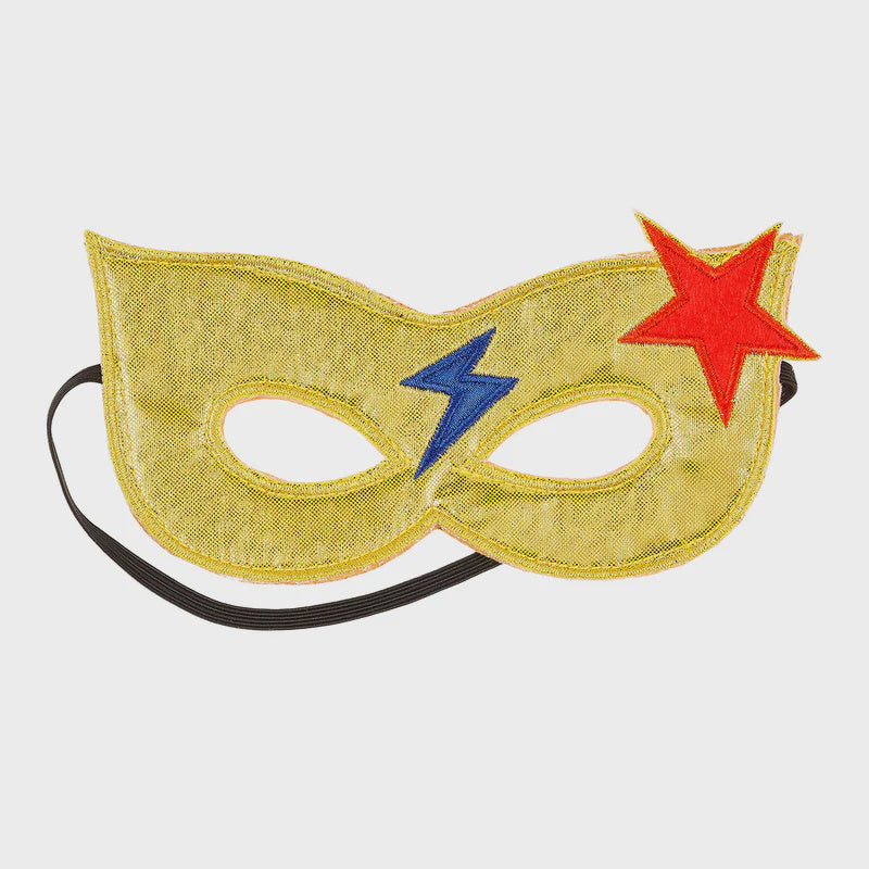 Gold superhero eye mask by Souza is a fun accessory for girls. Ideal for imaginative play, the golden mask features a vibrant red star and blue lightning bolt, with an elastic strap for easy wear. For Ages 3 and up. WARNING: CHOKING HAZARD - Small Parts. Not for children under 3yrs.