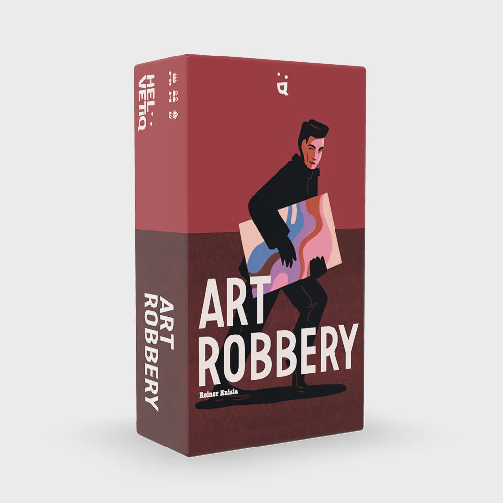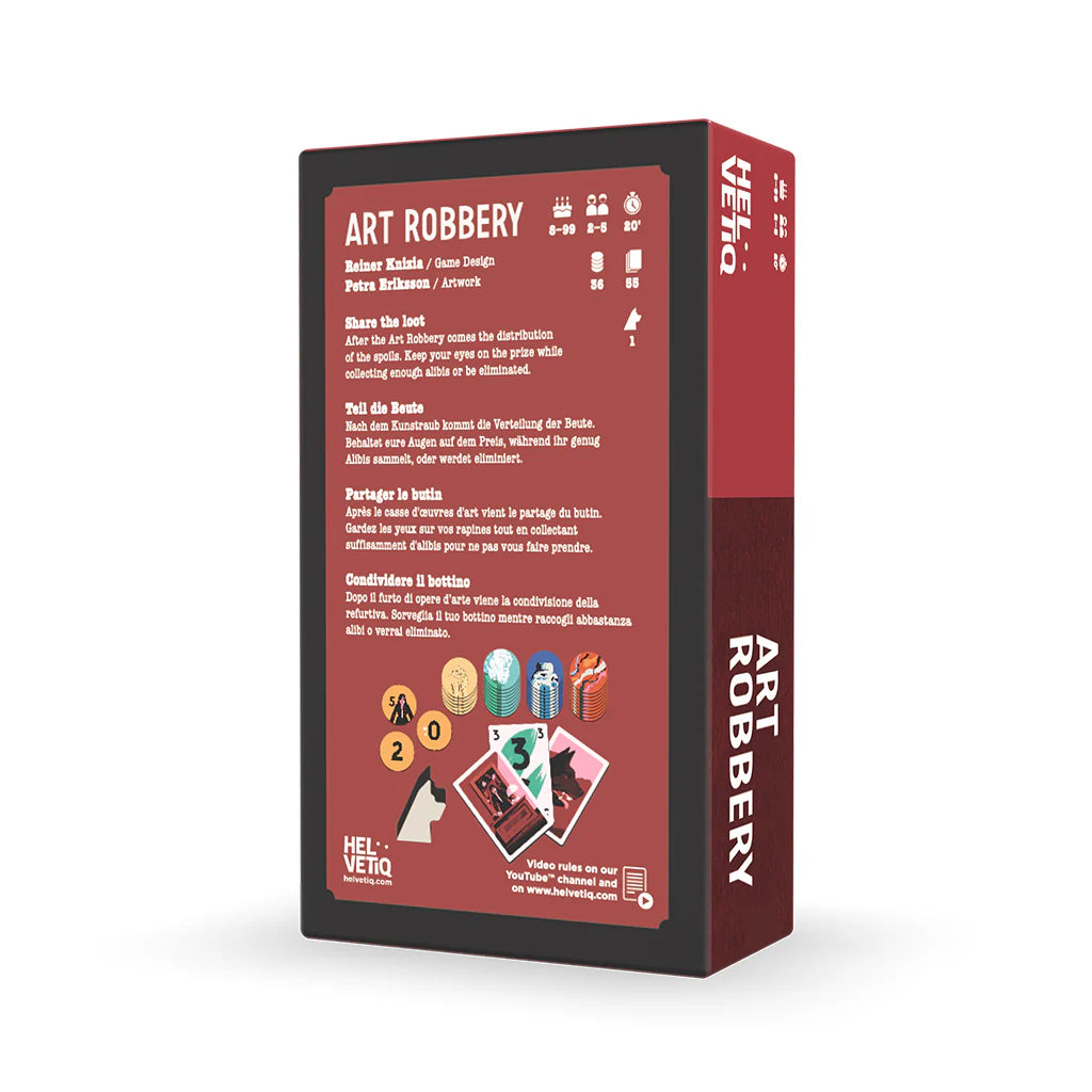 In Art Robbery, you slip into the role of art thieves. You have successfully put the robbery behind you, yet the spoils are not infinite and you are now facing your greatest challenge: distributing the loot. Over 4 raids, confront the other players and try to get a share of the four collections. Once collected, a loot tile can be defended by the guard dog. You can decide to be the greedy thief or the boss. But don’t forget to collect alibis or the police will catch you! In thend, the thief who is able to snatch most of the loot wins... maybe.