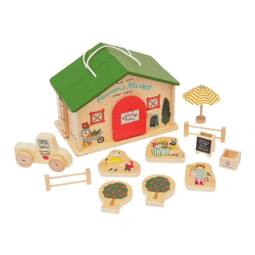 The farmer's market is open for business! Enjoy portable play-fill fun with the Market Day wood playset. This 12-piece set includes: 1 carry-along market, 1 truck with rolling wheels, 1 market umbrella, 2 fences, 1 market easel sign, 1 produce crate, 2 trees, and 3 animals. Play pieces fit inside the market when closed for easy storage. The rope handle allows for easy carrying and transport. Encourages imaginative role play, social learning and motor skill development. For Ages 3 and up. WARNING: CHOKING HAZARD - Small Parts. Not for children under 3yrs.