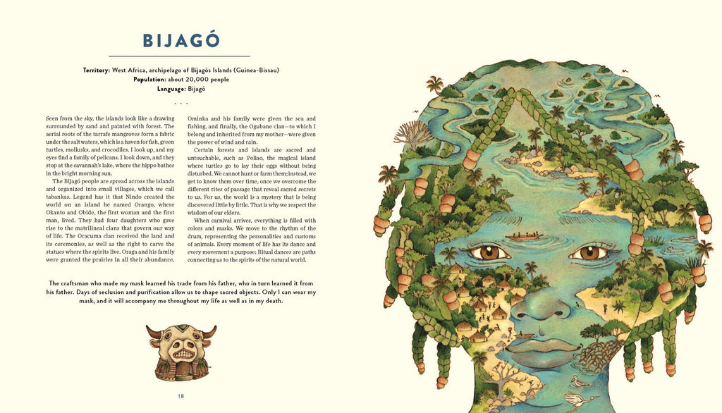 We are all one. We all inhabit the same planet, and we all have a common human origin. This is the core theme of this book. Each double-page spread presents a contemporary and fascinating look at more than 20 Indigenous peoples from across the globe. These first nations were the first humans to inhabit their territories, which are under threat today from “civilization” that seeks to profit from them and their lands. In these societies, a sense of community life prevails, based on reciprocity, solidarity, mutual aid, avoiding excess, and honoring what nature provides. Indigenous peoples are also the guardians of 80 percent of terrestrial biodiversity—they are the first conservationists of the natural environment. Franco-Uruguayan author Nat Cardozo has created a unique book with beautiful illustrations that blur the lines between humans and their environment and present a wide variety of ways of life from little-known cultures. In addition to collecting 22 first-person stories, this informative book is about the past and present of Indigenous peoples, recounting a long history of struggle and resistance and of defense—not only of their territories but also of their languages and traditional ways of life. This book provides a unique opportunity to remember our common origin and reflect on how we might create a new unity for humanity to reconnect us to living things and bind us together again as one.