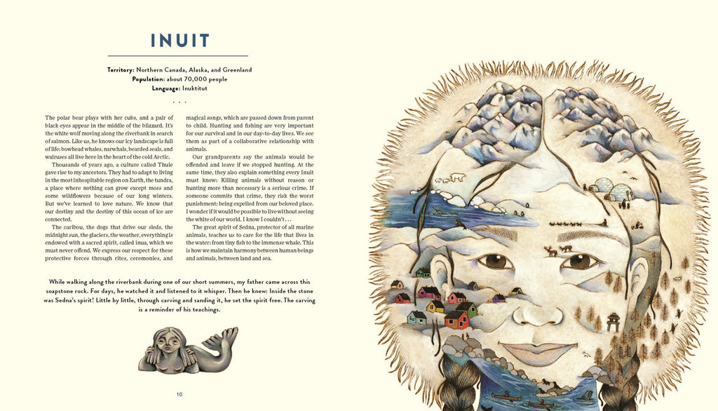 Native tribes featured in the book are from all five continents and include: !Kung, Orang Rimba, Inuit, Tuareg, Moken, Anangu, Bijago, Evenki, Bribri, Cherokee, Mosuo, Uru Chipaya, Tz'utujil, Ngati Hau, Wayuu, Q'ero, Sami, Mbuti, Juchiteca, Gitxsan, Dongria Kondh, Yanomami. For Ages 8 and up.