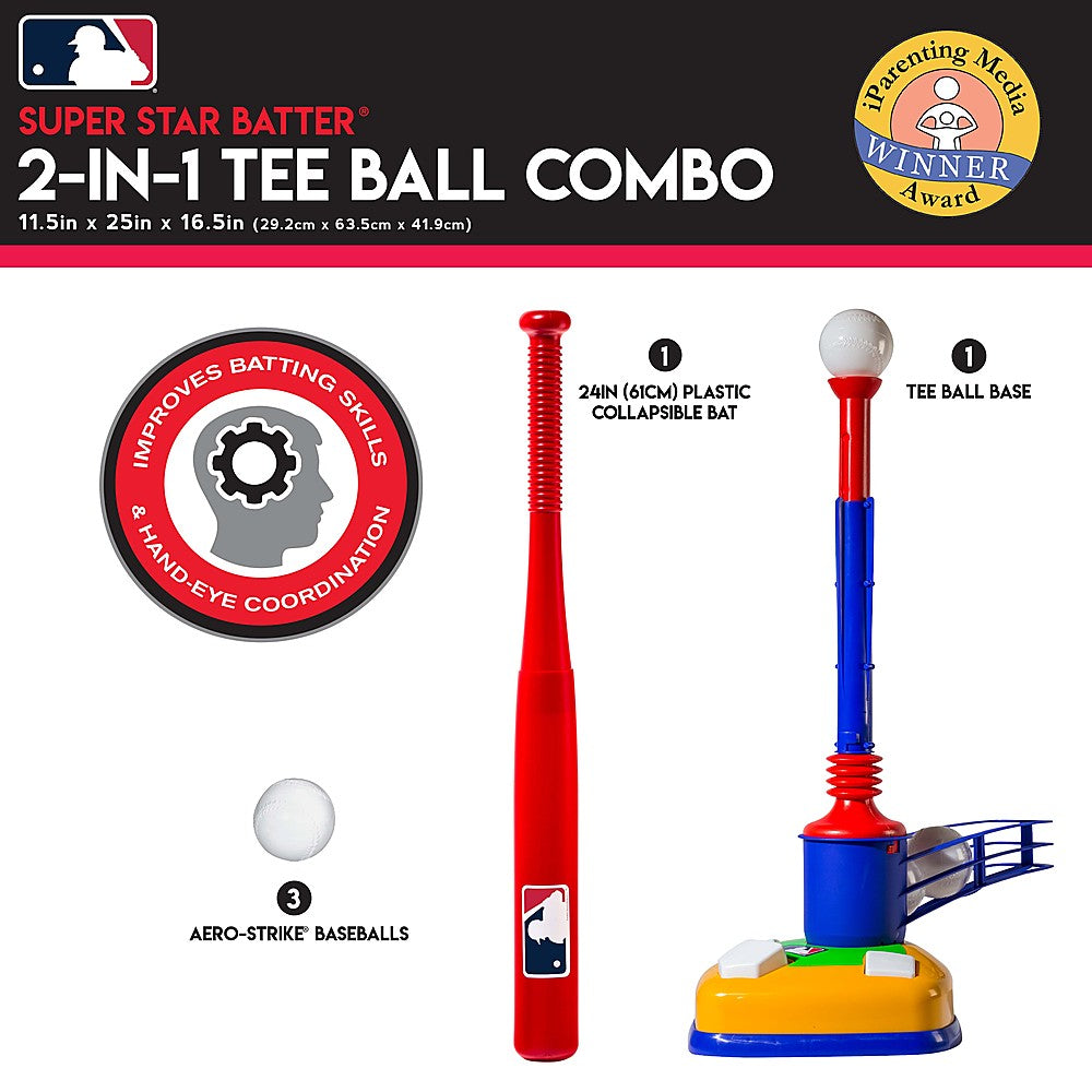 The Franklin Future Champs MLB Super Star Batter 2 in 1 Tee Ball Combo offers two fun ways for kids to learn to play baseball! Kids start by hitting from the tee. Once confidence is gained, simply remove the tee attachment to reveal the "pop up" function. Step on home plate to set the pitch, then release using the 1st base or 3rd base buttons. Perfect for both right and left handed hitters! Young athletes are sure to improve hand eye coordination skills as they play. The set comes complete with (1) 2 in 1 Tee Ball & Pop a Pitch Combo, (1) 22" collapsible telescopic baseball bat and (3) AERO STRIKE plastic baseballs to get the game started! For ages 5 and up. WARNING: CHOKING HAZARD - Small Parts. Not for children under 3yrs.