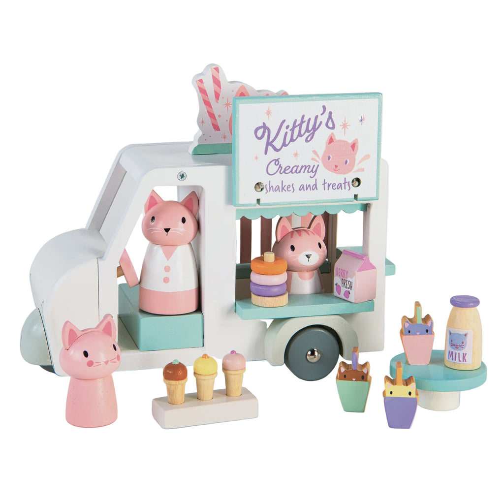 Meet Kitty and her hard working family! They are running about town serving up delicious milkshakes, doughnuts, and ice creams through the hatches on all 3 sides of their white 3 wheeler van. A fold up backdrop completes the scene and adds to more story telling opportunities. Good for imaginative play. Good for storytelling.