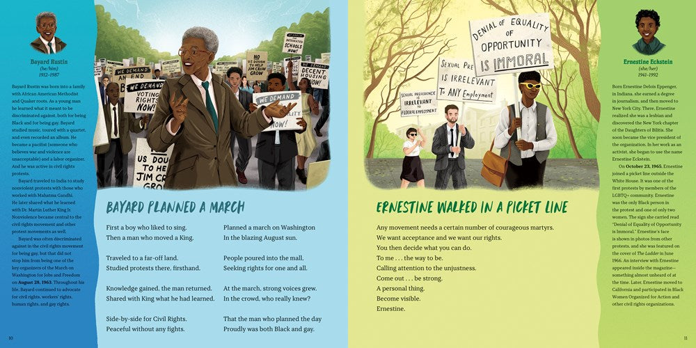 Young readers will learn about the lives and legacies of seventeen heroes of the queer community from both past and present. Marsha P. Johnson, Harvey Milk, Cleve Jones, Pauline Park, Richard Blanco, and Pete Buttigieg are just a few of the iconic figures represented in this wonderfully designed and colorful picture book with illustrations by Harry Woodgate. A perfect introduction to the people who have stood up for what they believed in, lived lives according to their own ideals, and their partners, friends, and allies, the poetry in this book provides great read-aloud potential sure to entertain and inform readers of all ages.