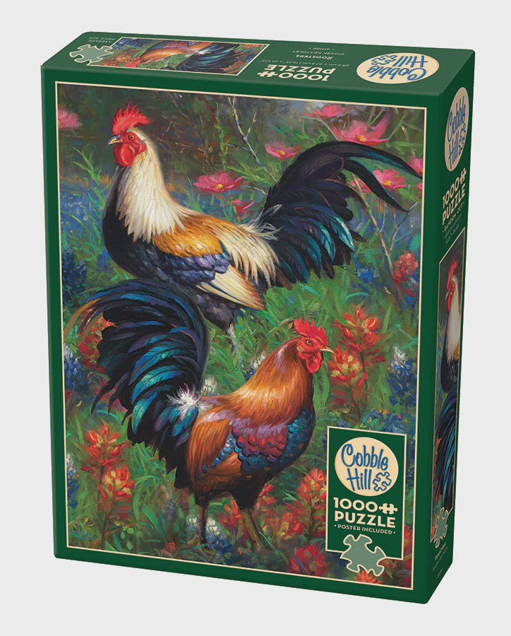 The beautiful jewel tone hues flatter the two Roosters in the field of flowers. A great 1000 piece animal puzzle. For Ages 12 and up. WARNING: CHOKING HAZARD - Small Parts. Not for children under 3yrs.