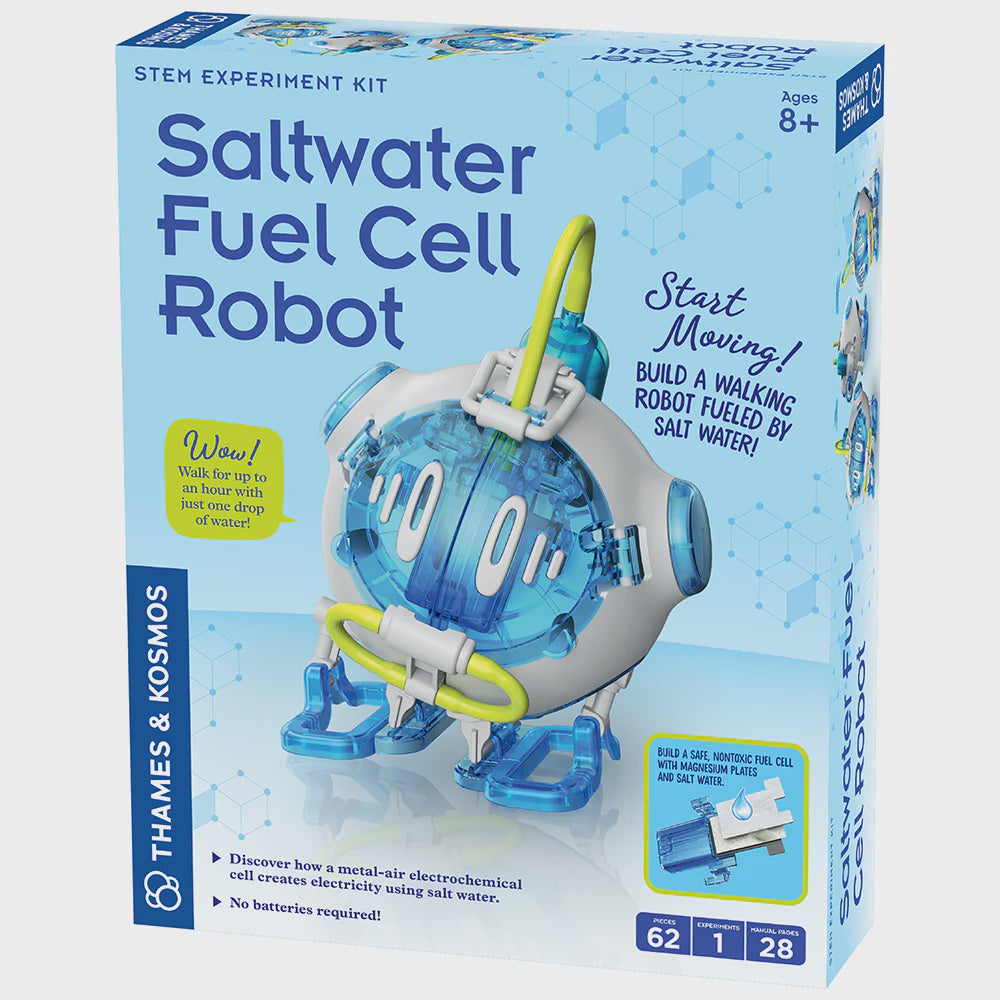 Discover how a metal-air electrochemical cell stores and discharges electrical energy using a simple saltwater solution. Explore the science of electricity, currents, and electric potential. An innovative pump mechanism provides a steady drip of salt water onto the magnesium plates and the robot walks for up to one hour on just one drop of salt water! The “fuel” bottle is easy to clean, refill, and reuse for hours of exploration.