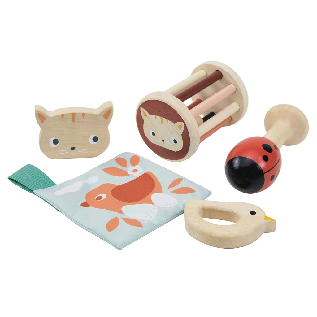 The ladybird rattle will emit a soft sound when shaken and the handle is easy for small hands to grip. The wooden bird teether is perfect for grasping and safe for chewing! The printed fabric square can be attached to a pram with a velcro tag and will make a crinkle sound when scrunched.