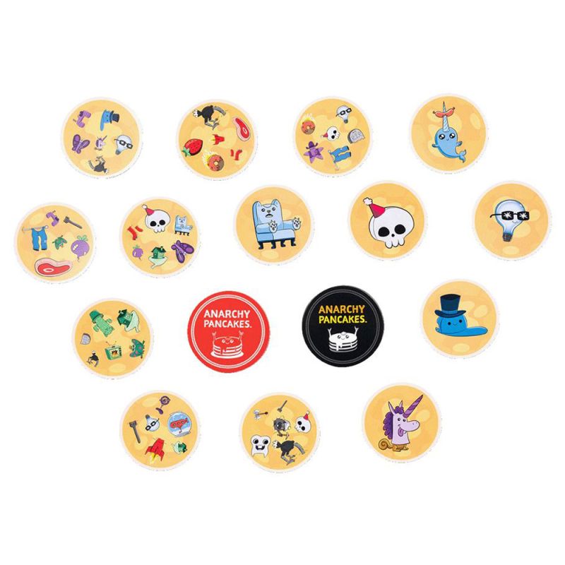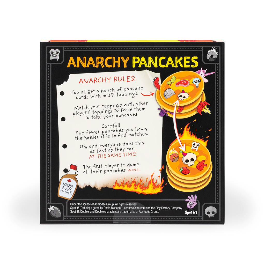 A card game for people who think that chaos is pretty sweet. In this frantic, fast-paced game, you all get a bunch of pancake cards with misfit toppings. Match your toppings with other players' toppings to force them to take your pancakes. Everyone should be working to do this as fast as they can at the same time. The first player to dump all their pancakes wins. It's 100% pure mayhem. For Ages 7 and up. WARNING: CHOKING HAZARD - Small Parts. Not for children under 3yrs.