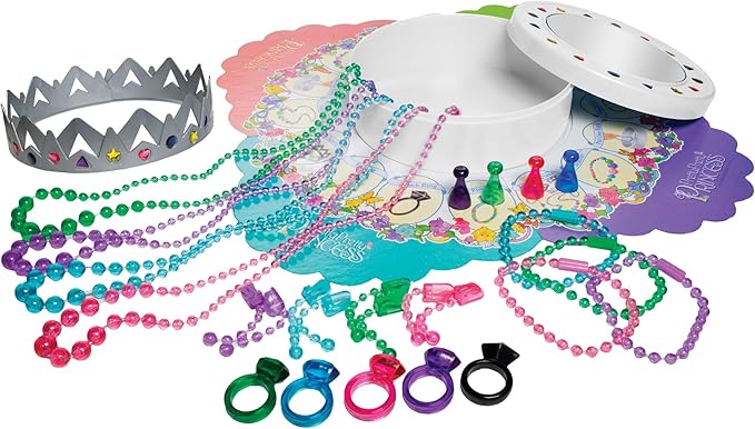 The lovely, pearlized Jewelry Box is great to store all four sets of sparkly princess jewelry, the special black ring and the four plastic movers. The lid has a built-in mirror (to admire your princess look, of course) and the game's spinner. Have fun decorating your Jewelry Box with the included set of stick-on "jewels"!