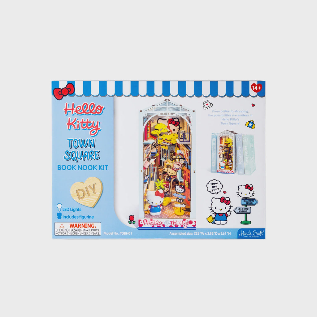 Step into the delightful world of Hello Kitty Town Square with this charming DIY miniature book nook! This beautifully crafted scene features a cozy alleyway filled with inviting cafes, lush plants, and charming little shops, capturing the peaceful vibe of a lively town square. At the heart of the alley, Hello Kitty stands happily, adding a sense of joy and warmth to the entire scene. The kit comes with small LED bulbs that gently illuminate your space. With a simple touch, you can easily turn the warm, soothing light on or off, adding the perfect finishing touch to your book nook. 2 AAA batteries required, not included. For Ages 14 and up. WARNING: CHOKING HAZARD - Small Parts. Not for children under 3yrs.