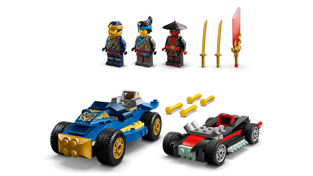 This LEGO set comes with 2 ninja car toys – a ninja car with moving wheels and 2 shooters with 4 darts, and the villains’ toy car – so kids can place a minifigure character behind the wheel of each one and get racing! There are also 3 NINJAGO minifigures: ninja warriors Rogue and Nya armed with golden katana sword accessories and the evil Drix with a translucent reveal blade accessory. For Ages 4 and up. WARNING: CHOKING HAZARD - Small Parts. Not for children under 3yrs.