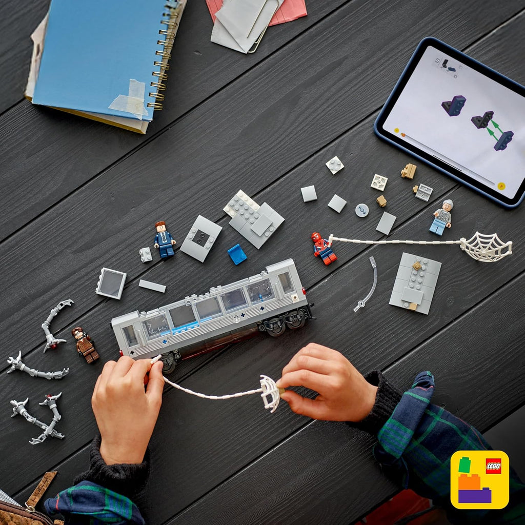 Young heroes ages 9+ can recreate an action-packed showdown with the LEGO Marvel Spider-Man vs. Doc Ock Subway Train Scene (76321) building set. Kids build a runaway subway train, then help Spiderman try to stop it while avoiding Doc Ock and his mechanical tentacles. The subway train features a removable roof for access so builders can cast their favorite minifigures as innocent bystanders. The detailed set includes four minifigures from the movie: Spider-Man with interchangeable masked and unmasked heads, Doc Ock with four posable tentacles, J. Jonah Jameson, and Aunt May. For even more pretend play adventures, Spider-Man has a large attachable web and Doc Ock's mechanical arms feature laser beams and train-gripping clips. After playtime is over, the playset doubles as epic room decor. This buildable Marvel toy makes an exciting gift for boys, girls, and collectors who love super heroes and the Marvel universe. For more building fun, the LEGO Builder app offers 3D modeling and helpful tools. Contains 393 pieces.