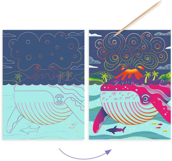 A set of 4 scratch boards with hints of gold on the fascinating world of dinosaurs. Children reproduce the patterns designed by the artist by scratching the surface with the wooden stylus. Little by little, the dinosaurs come to life against their background! Gold metallic areas. What fun it is to uncover the hidden illustrations! For Ages 7 and up. WARNING: CHOKING HAZARD - Small Parts. Not for children under 3yrs.