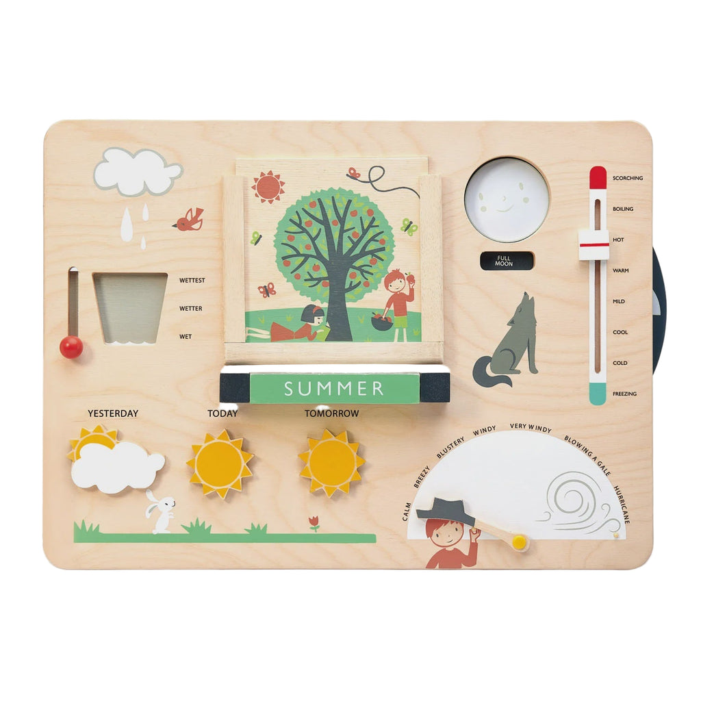 A top-quality illustrated wood Weather station that links all aspects of climate into a simple and educational board that can be hung up on a classroom wall or played with on a tabletop. Rainfall, wind speed, temperature, seasons and a daily 'what is the weather like today' as well as a novel moon phase wheel teaches about cycles.