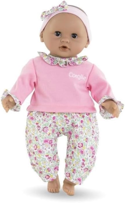 Bébé Calin Maria is a 12-inch baby doll - the perfect size for little mommies and daddies to rock and cradle in their arms. The doll's soft body is posable like a real baby, she can even suck her thumb, also like a real baby. Her face, arms and legs are made of touchably soft vinyl that is delicately scented with vanilla -- a Corolle signature -- so that the hugs children give their doll are as sweet and memorable as the hugs their parents give them. Bébé Calin Maria has brown sleepy eyes that close when it's put down for a nap or at bedtime. She is dressed in a floral overall with a pink T-Shirt and wears a matching headband. Bébé Calin Maria is part of the mon premier poupon Corolle collection of dolls, fashions and accessories for early nurtering time. For ages 18 months and up.