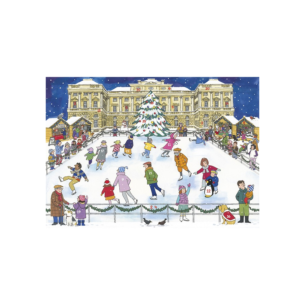 A favourite activity at Christmas time - ice skating, shown here on a busy rink in front of a country house. Open a door each day to find a festive illustration. Dimensions: 8x6in.