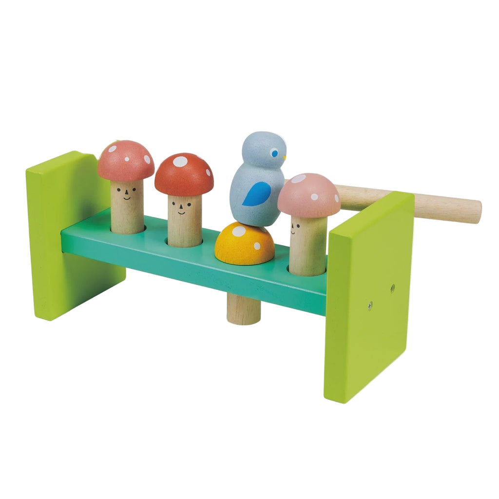 This woodland-themed game comes with a tray with 4 smiley-faced toadstools. There is a hammer in the shape of a bluebird to bash the toadstools down.